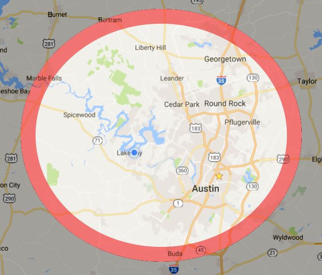 The majority of my clients are right here in the metro Austin area, so basically if you live inside that red circle, I’ll come to you. My immediate neighborhoods are Oak Hill, Westlake, Lakeway, Bee Cave, Steiner Ranch and I can often come to you the same day. I often am going to Liberty Hill, Driftwood, Lago Vista, Cedar Park, Round Rock and Spicewood.